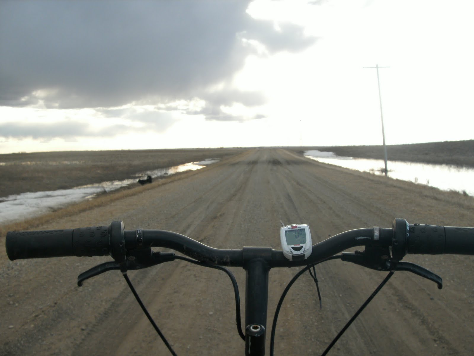Finley had a wonderful time. He had all his favorite activities---running along while I ride my bike, swimming, chasing birds, getting dirty---combined into one event of supreme euphoria. He was somewhat frousled by the time we went home. He thinks nothing of galloping across floating snow and plunging into the waters beneath; it's all part of the fun for him. He was so full of burrs he looked like he had his ears up in curlers. Someone's sleeping on the couch if he does that too many more times! For anyone who wonders what anyone could possibly see in such desolate, empty country, here is a photographic sampling of a prairie bike ride during thaw.