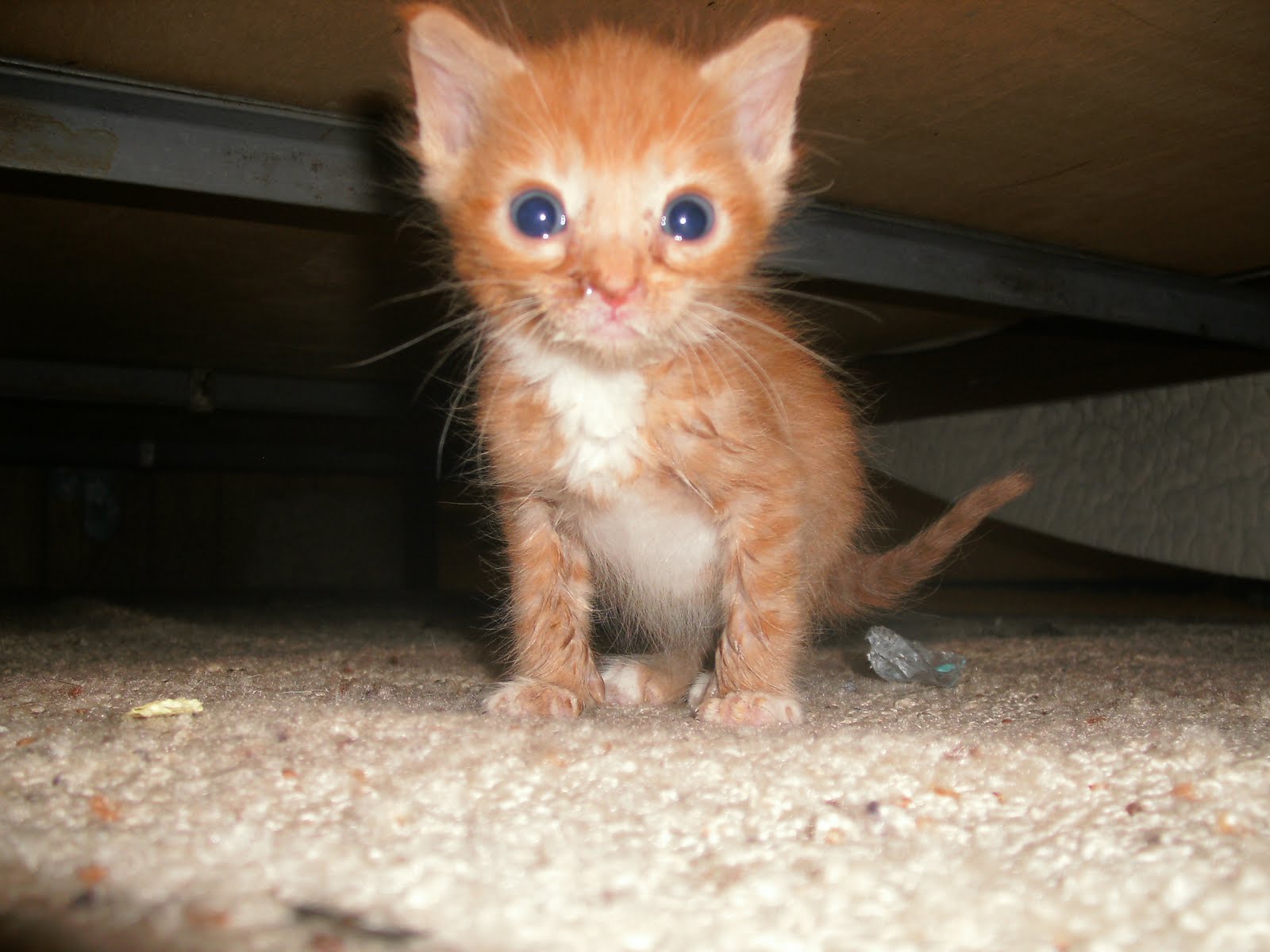 Soon, the cream starvation kitten gained back enough strength to eat like a pig. No longer worried about starvation, I started worrying about things like stomachs bursting and such. The orange baby was almost well in one week, and once he could breathe enough to eat, boy did he eat. He still is frantic at mealtimes and chases after the bottle with wild snuffling noises as if he were a truffle-sniffing pig. Take off the truffle-sniffing and you just about have it!